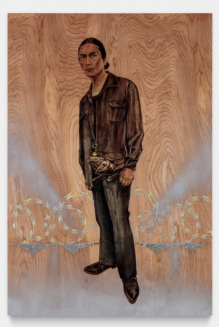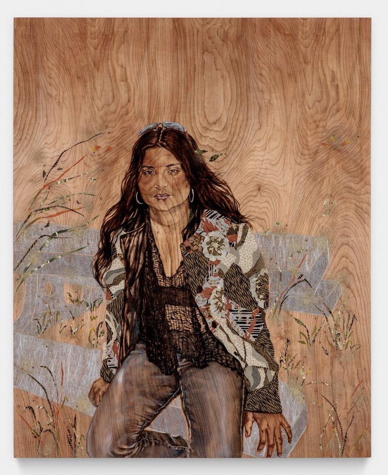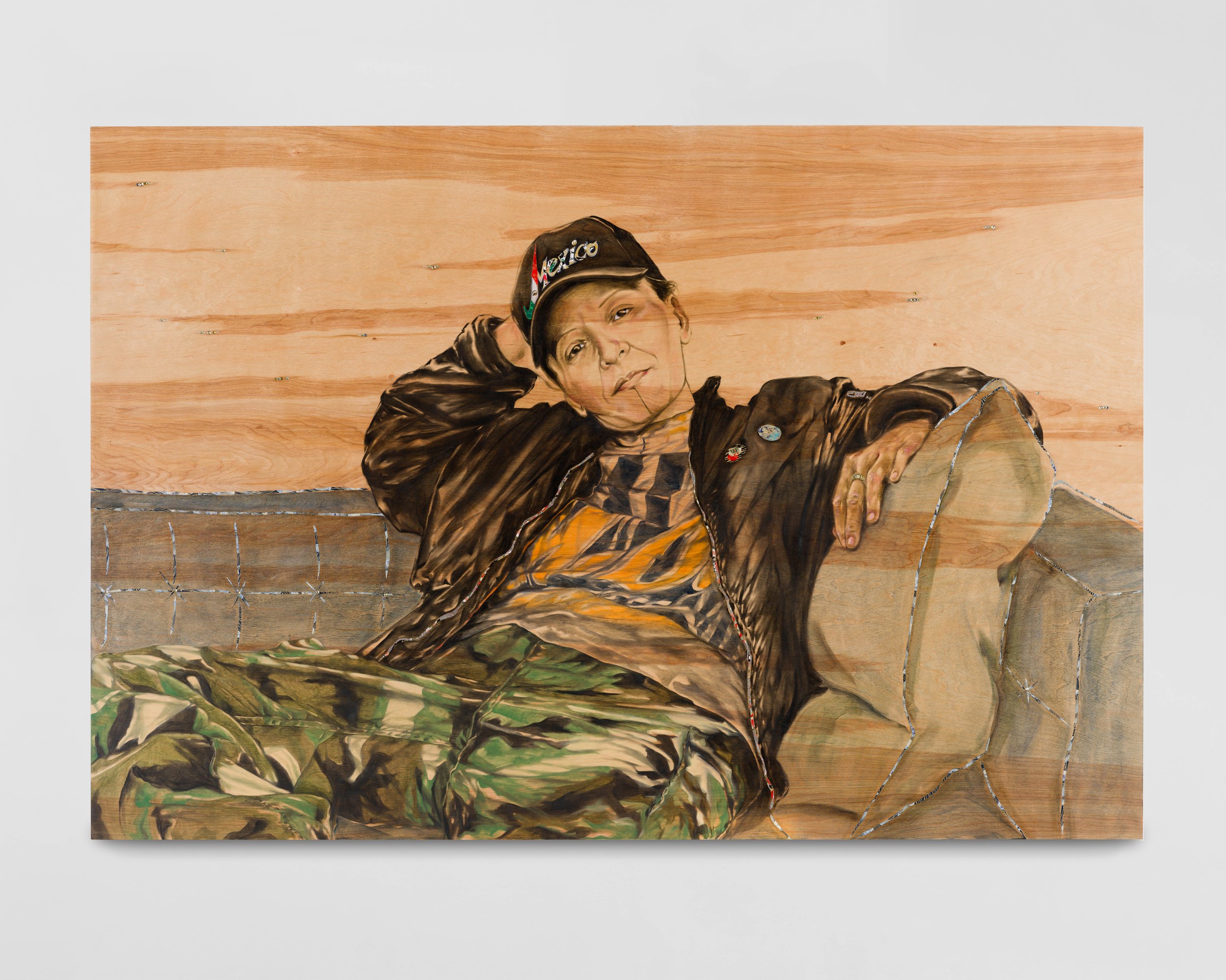Lupe in Mexico Cap, 4x6 feet, oil paint, washi paper on wood panel