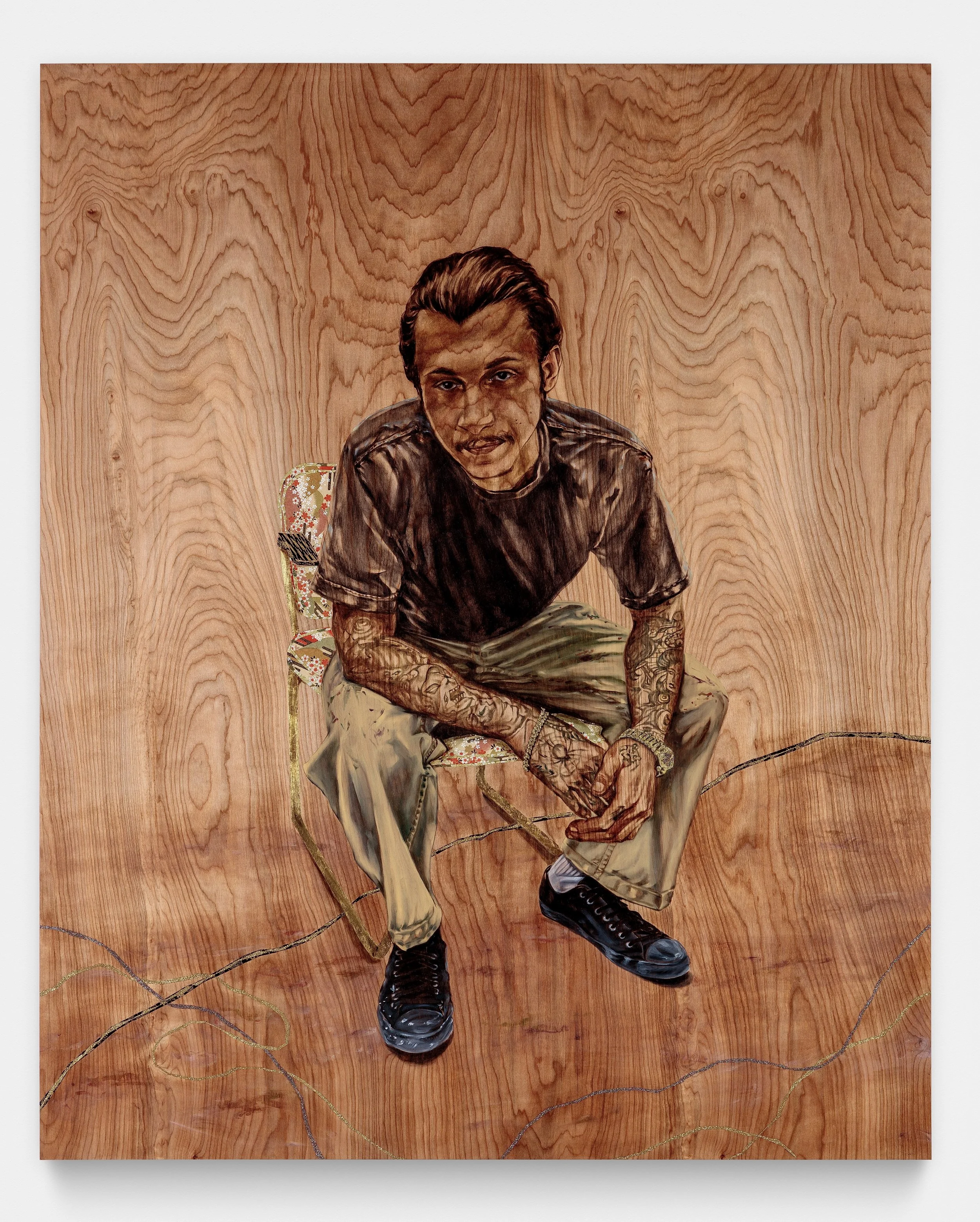 oil paint, metal leaf, washi paper on wood panel